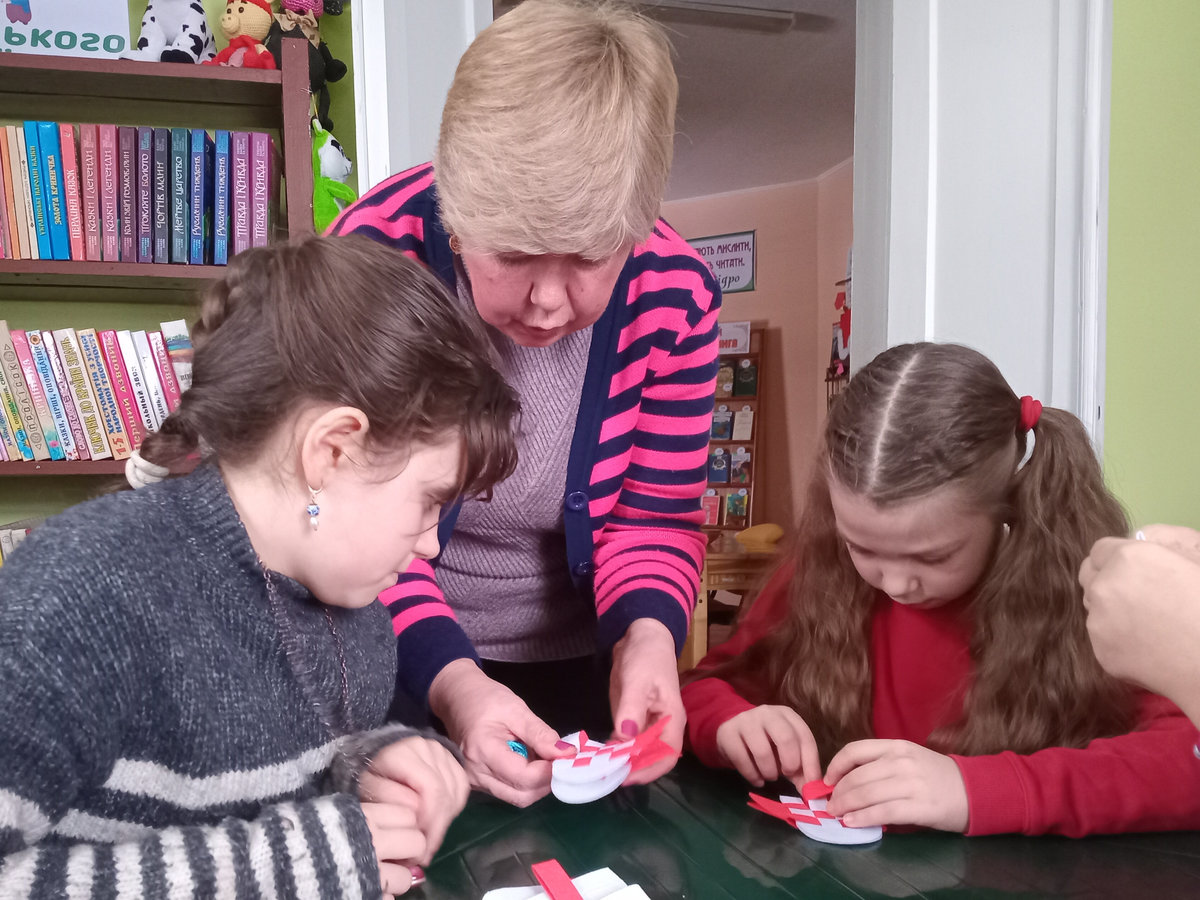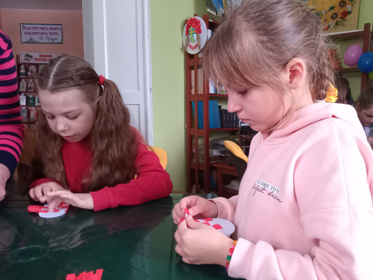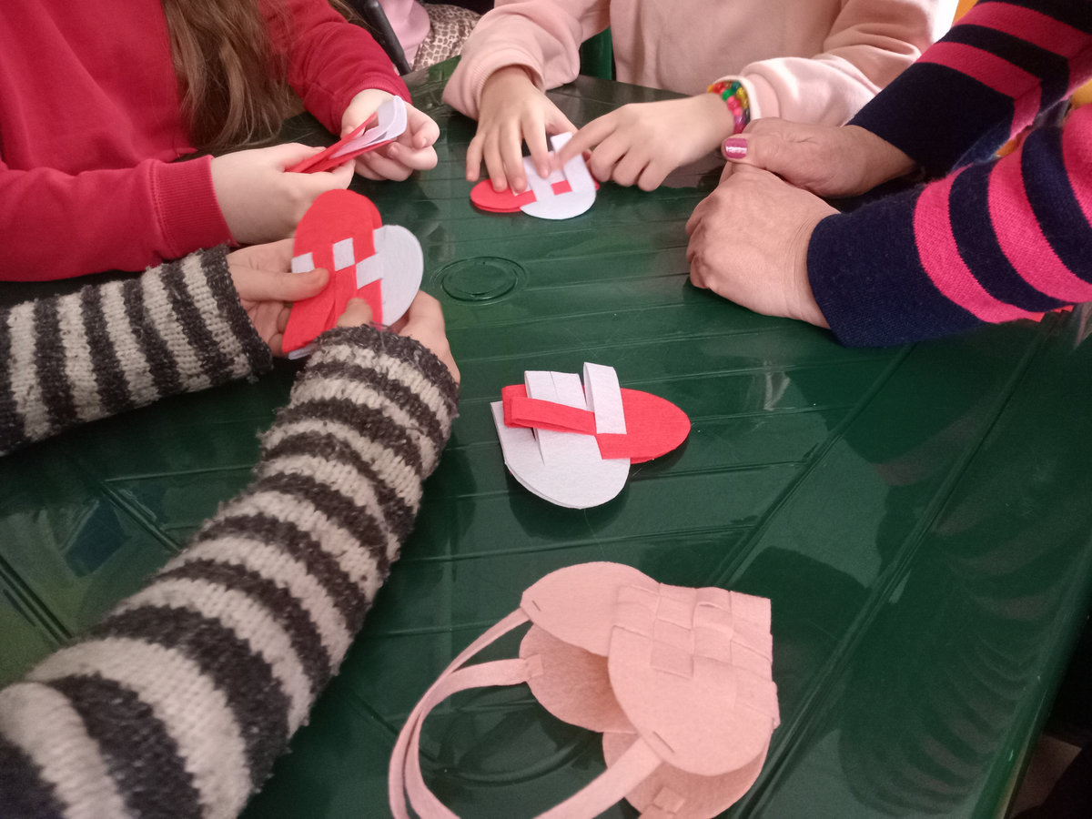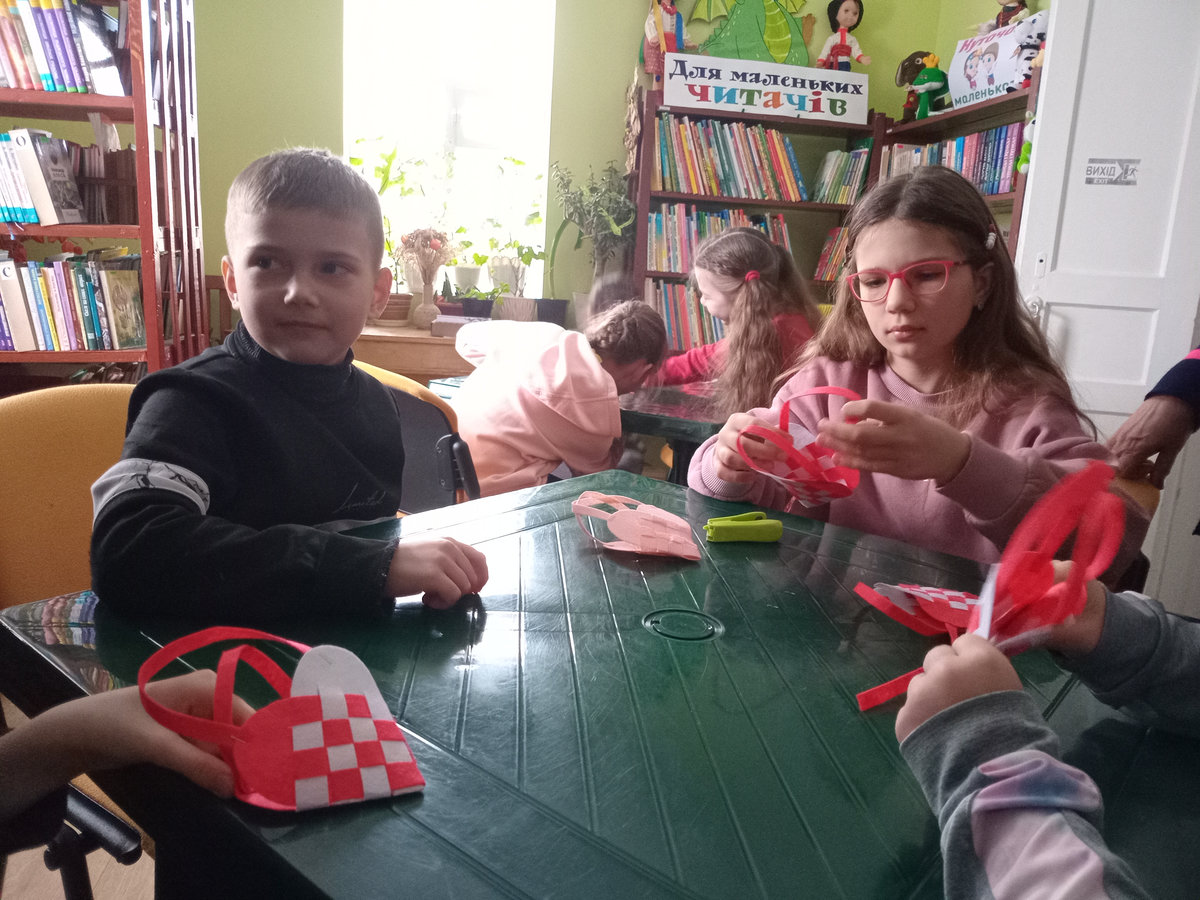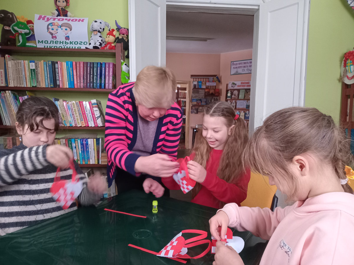 Під її наставництвом зробити це було не складно: потрібно було лишень вирізати із фетру два клаптики-заготовки білого та червоного кольорів, з’єднати їх і переплести. Ручки для сумочки – червоні смужечки, теж вирізали з фетру, скріпивши їх степлером. У таку сумочку можна покласти цукерки, валентинку, якусь прикрасу тощо.