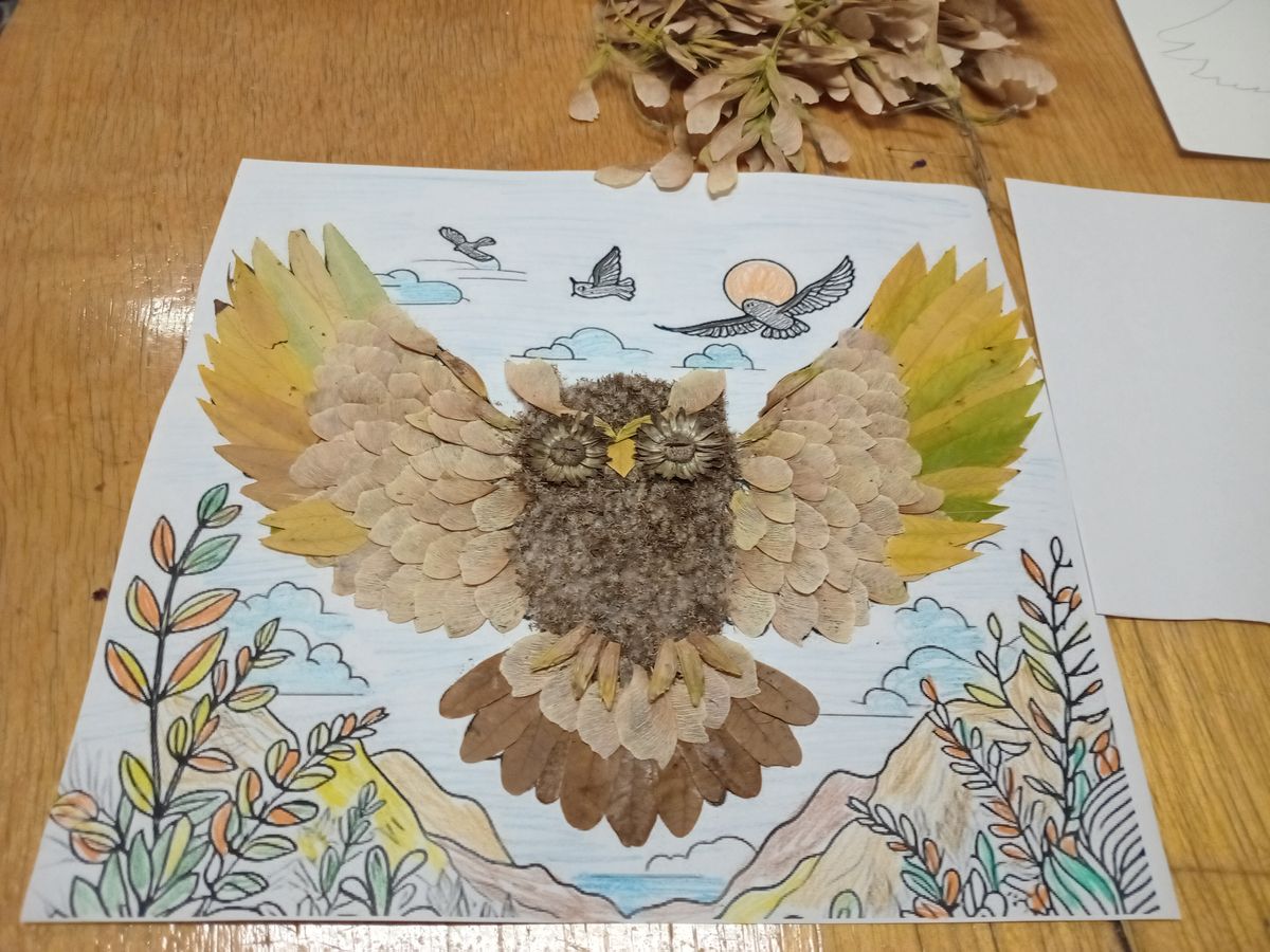 «Золота» осінь – найкращий час для творчості. Наявність навколо великої кількості різноманітних природних матеріалів: яскравих листочків, квітів, трав, насіння, плюс клей, картон і ножиці, та плюс уява – і на картині вже оживає «Сова».