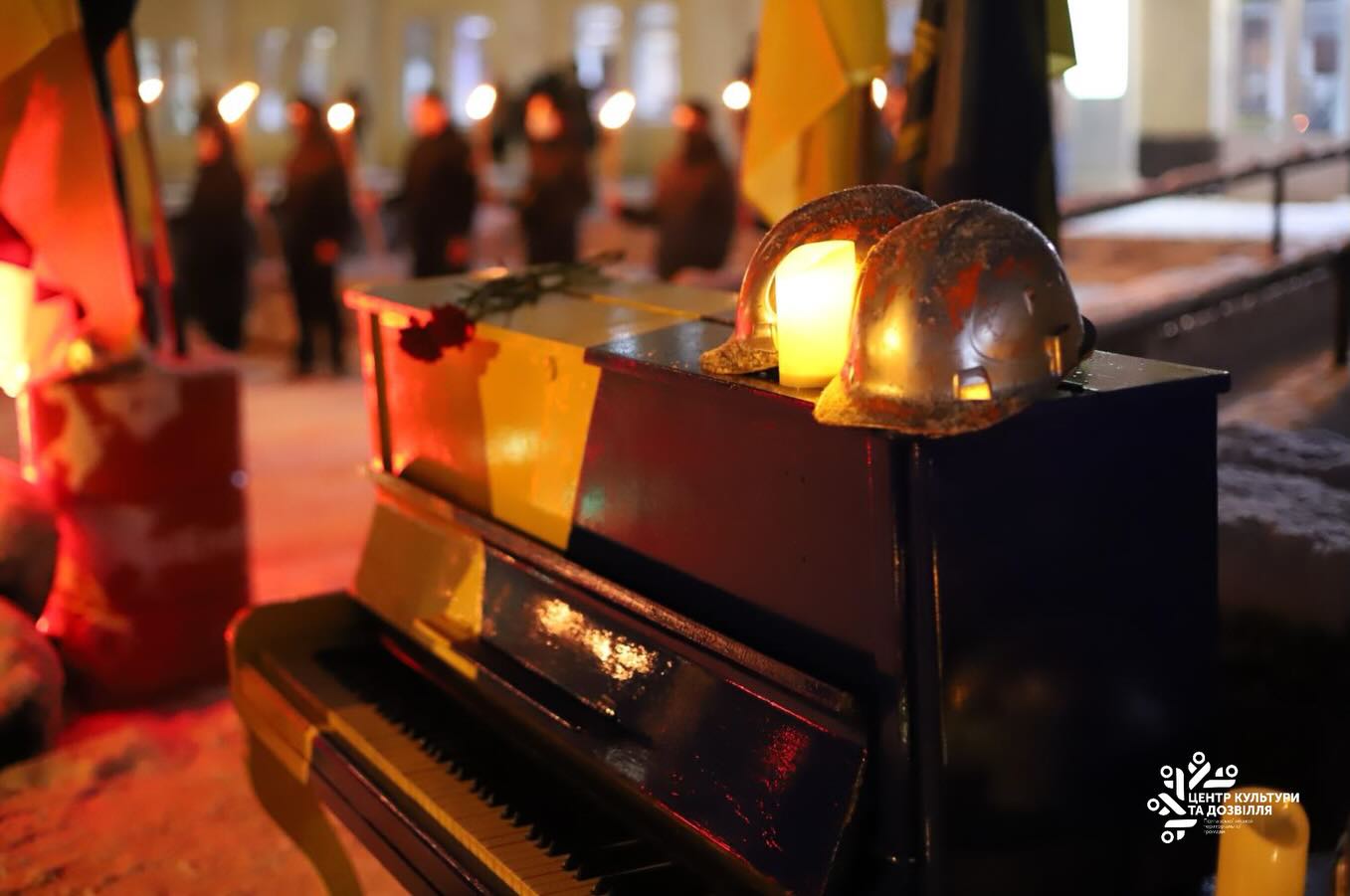 Простір площі частково відтворював атмосферу Майдану: шини, каски, державний прапор. Особливим символом стало синьо-жовте фортепіано — як знак незламності культури навіть у найтемніші моменти історії.
