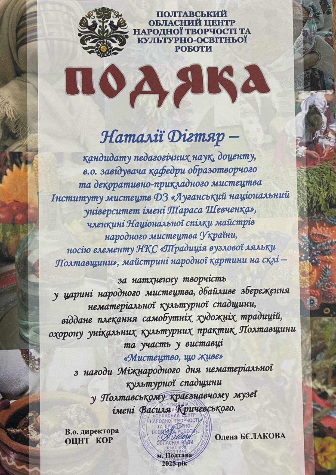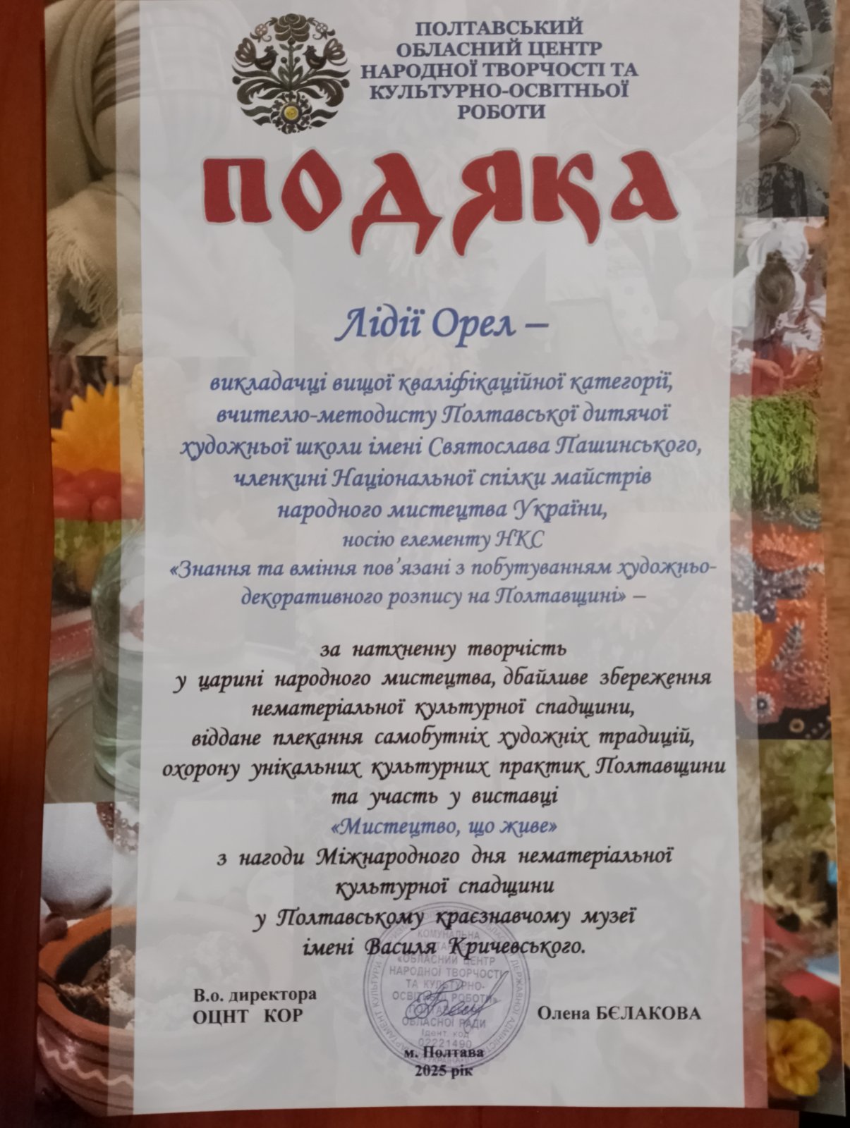 15 жовтня 2025 року викладачі Полтавської дитячої художньої школи імені Святослава Пашинського, члени Національної спілки майстрів народного мистецтва України - Дігтяр Наталія Миколаївна та Орел Лідія Олексіївна взяли участь у заході, присвяченому Міжнародному Дню охорони нематеріальної культурної спадщини ЮНЕСКО, що відбувся в Полтавському краєзнавчому музеї імені Василя Кричевського. Майстрині представили свої твори - взірці полтавського розпису на одноденній виставці творів носіїв елементів нематеріальної культурної спадщини України. Їхні роботи посіли почесне місце на виставці поряд з творами інших майстрів народного та професійного декоративно-прикладного мистецтва Полтавщини.