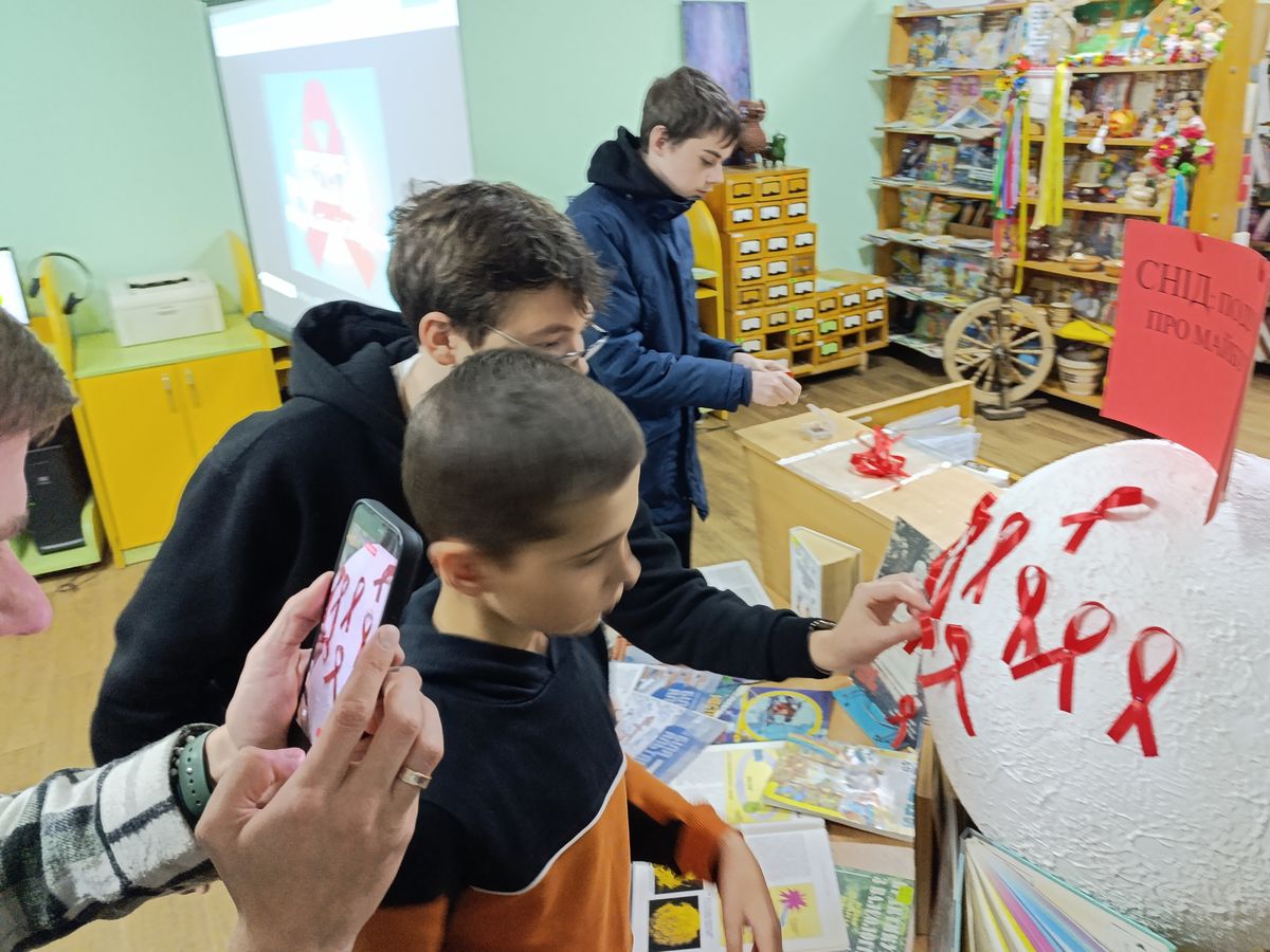 Діти також дізналися історію символу «червоної стрічки» та долучилися до підтримки тих, хто бореться зі СНІДом: кожен прикріпив маленьку червону стрічку до стилізованої земної кулі.