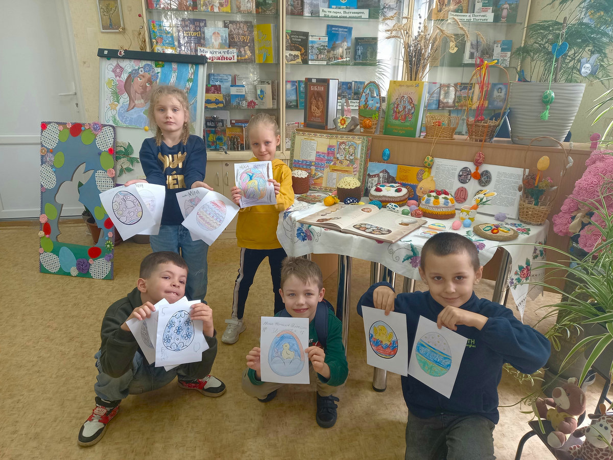 Не менш цікавим та захопливим стало проведення Великодньої вікторини «Калейдоскоп Великодня». На гостину до бібліотеки були запрошені її найменші читачі вихованці гуртків Полтавського міського центру позашкільної освіти. Це була не просто гра на швидкість чи ерудицію, а справжнє інтелектуальне мереживо, яке допомогло розкрити глибинний зміст свята, а процес пізнання перетворився на захопливу пригоду. В ігровій формі діти познайомилися з символікою орнаментів, історією свята, а також зібрали «Великодній кошик».
