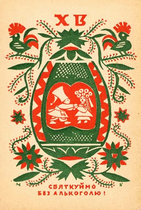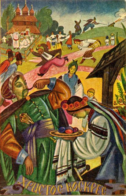 В оформленні Великодніх листівок початку – середини ХХ ст. зображення найрізноманітніших народних обрядів і атрибутів часто поєднували з державною символікою. Типовим для них є напис «Христос Воскрес – воскресне Україна» і образ козака, як уособлення народного героя-переможця.