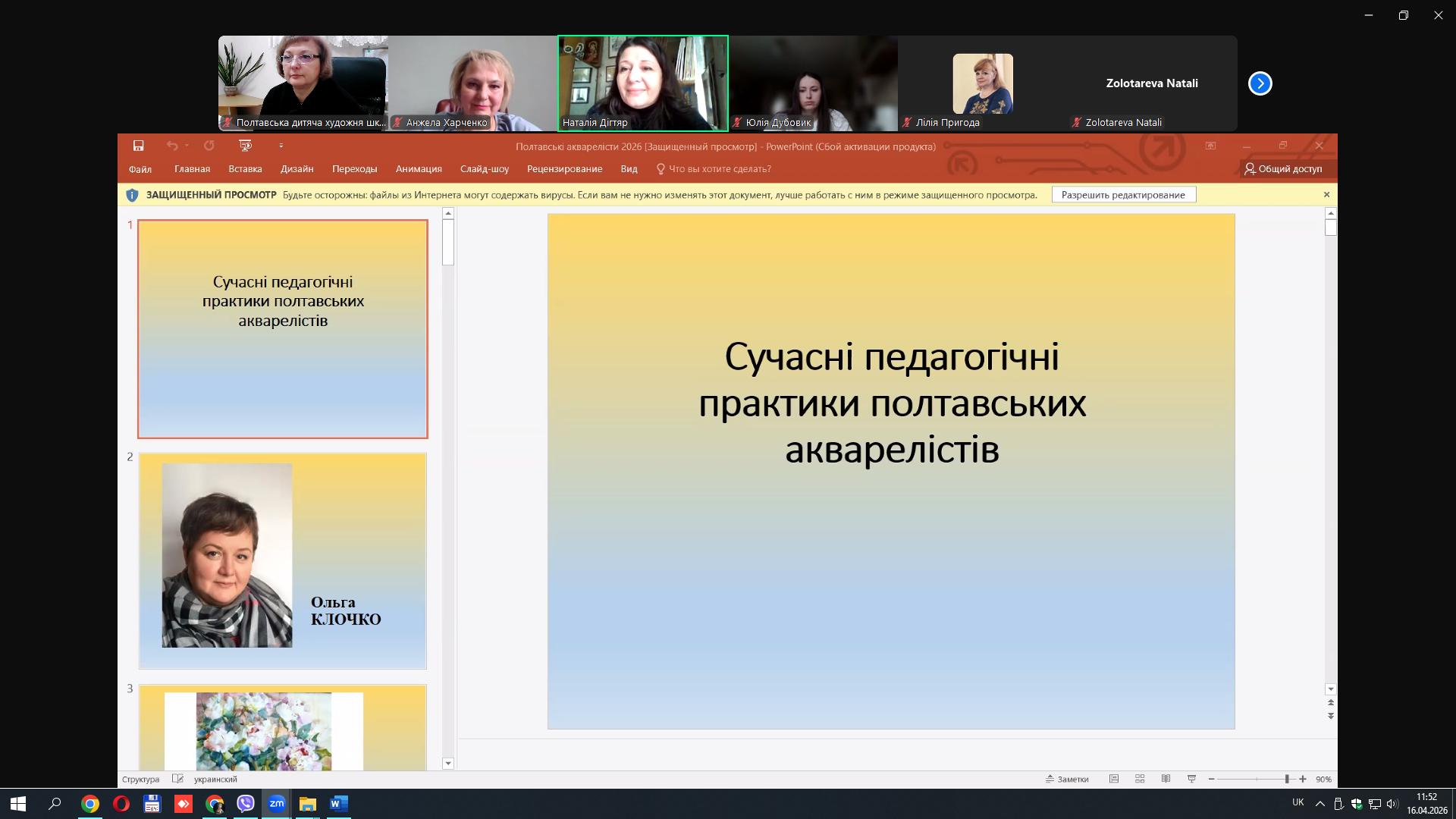 Сьогодні, 16 квітня 2026 року, викладачі Полтавської дитячої художньої школи імені Святослава Пашинського Валентина Тарасенко, Андрій Тарасенко, Ірина Пашинська, Мирослава Фісун, Наталія Дігтяр на чолі з директором Іриною Коноплею та заступником директора з навчальної роботи Оксаною Семер'яновою взяли онлайн участь у роботі міжнародного кросмистецького конгресу "Полікультурна багатовимирність - шлях до діалогу та розвитку" на платформі ZOOM. Представлені педагогічними працівниками доповіді, що побудовані на досвіді роботи, будуть видані у збірці за результатами конференції.
