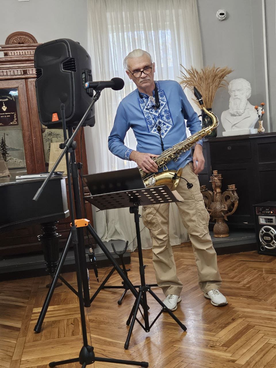 Цього вечора до музею завітав Віктор Перетятько — людина, яка своїм прикладом доводить: ніколи не пізно почати спочатку. Після багаторічної роботи на підприємстві критичної інфраструктури, уже на заслуженому відпочинку, він вирішив здійснити свою давню мрію — навчитися грати на саксофоні.