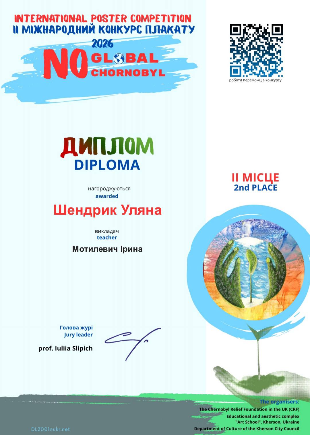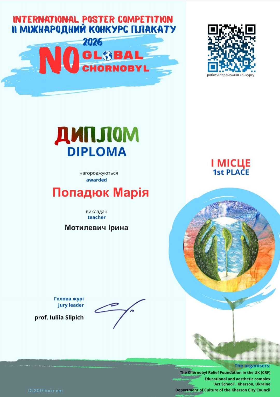 Вітаємо з перемогою у ІІ Міжнародному конкурсі плакату «No Global Chornobyl» Попадюк Марію (1 місце) та Шендрик Уляну (2 місце) (викладач Ірина Мотилевич). Щиро бажаємо нових творчих здобутків.