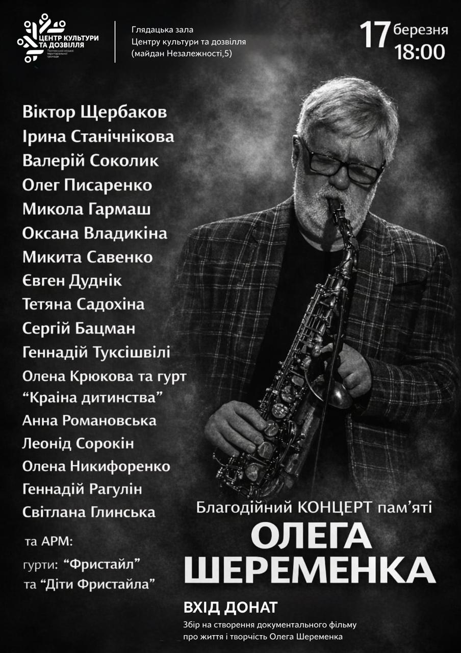 17 березня о 18:00 у Центрі культури та дозвілля відбудеться концерт пам’яті Олега Шеременка — саксофоніста, аранжувальника та музиканта, якого колеги називали “людиною-оркестром” за його багатогранний талант і невичерпну творчу енергію.