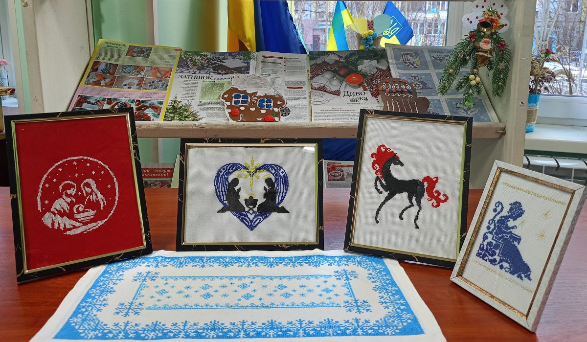 У читальній залі бібліотеки-філії №7 ЦБ ПМТГ святкову атмосферу створюють вишиті мініатюри новорічно-різдвяної тематики, виготовлені невтомною волонтеркою, талановитою майстринею Зоєю Дацько. У її роботах — тепло рук, любов до українських традицій і віра в краще. Особливу увагу привертає вишитий символ нинішнього Нового року — Кінь із вогняною гривою та хвостом, як уособлення сили, руху вперед і життєвої енергії.